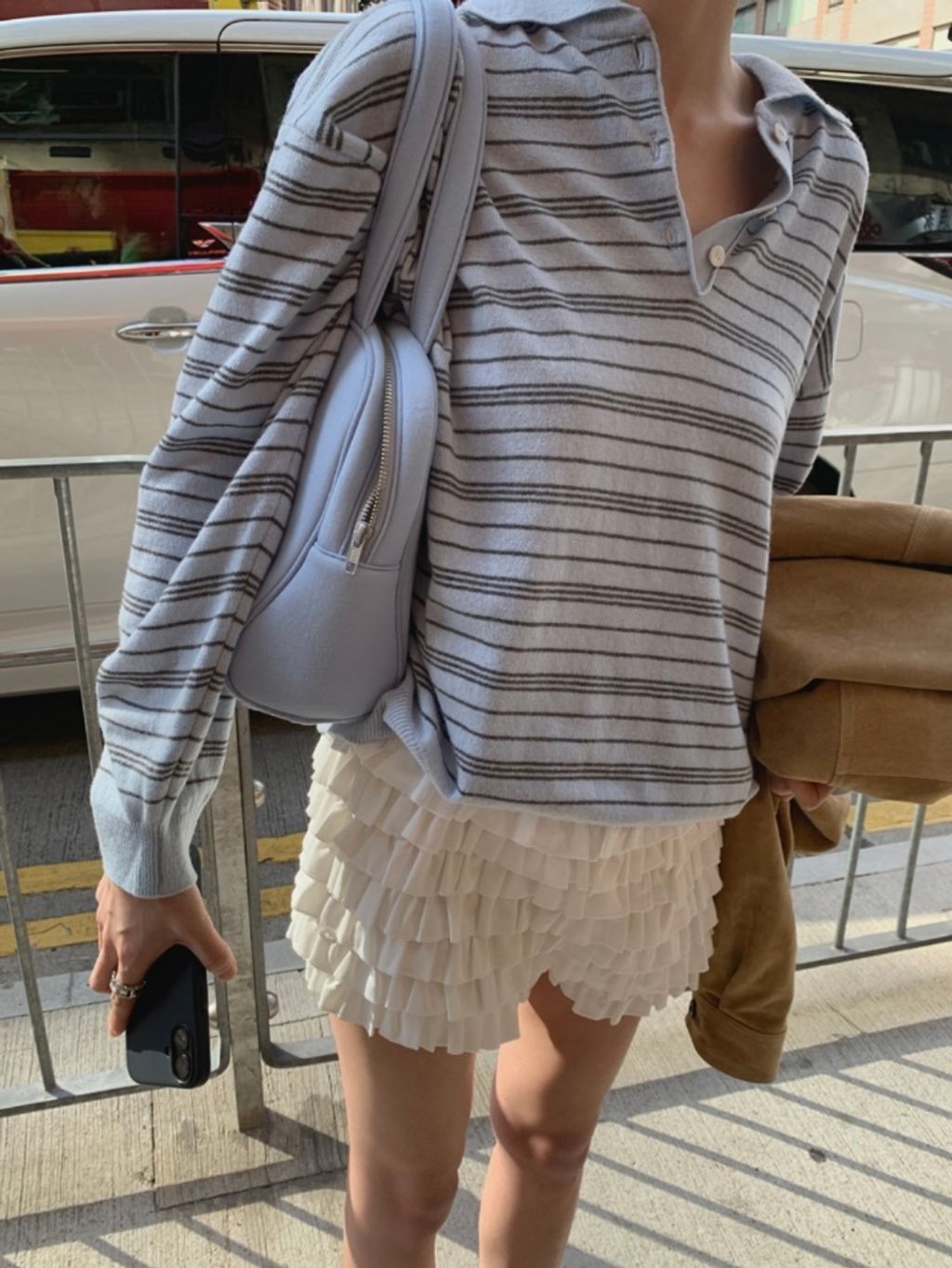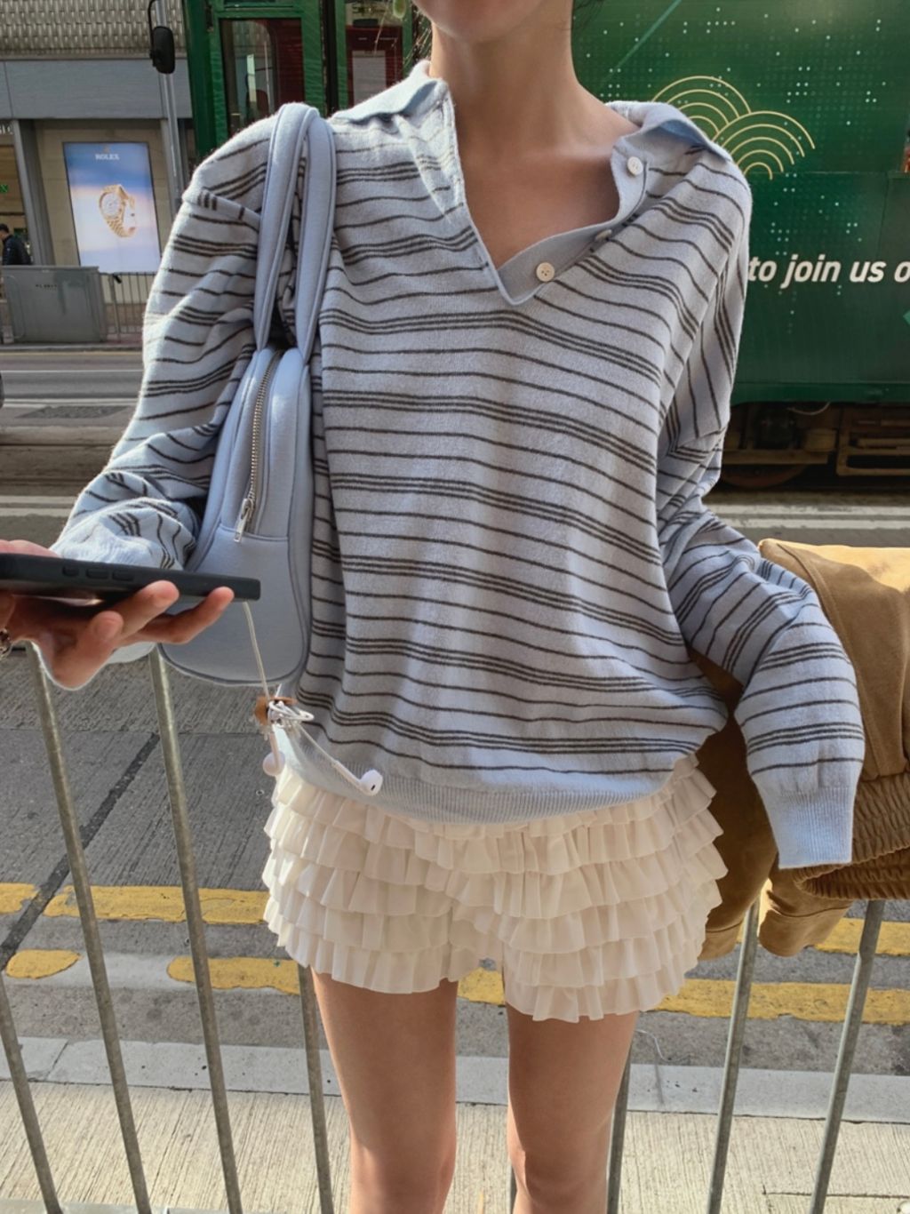寬鬆設計的垂墜設計配上polo領口