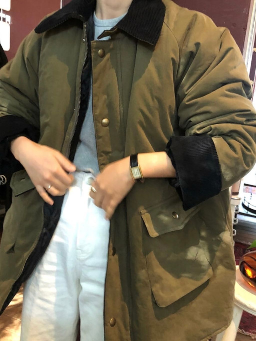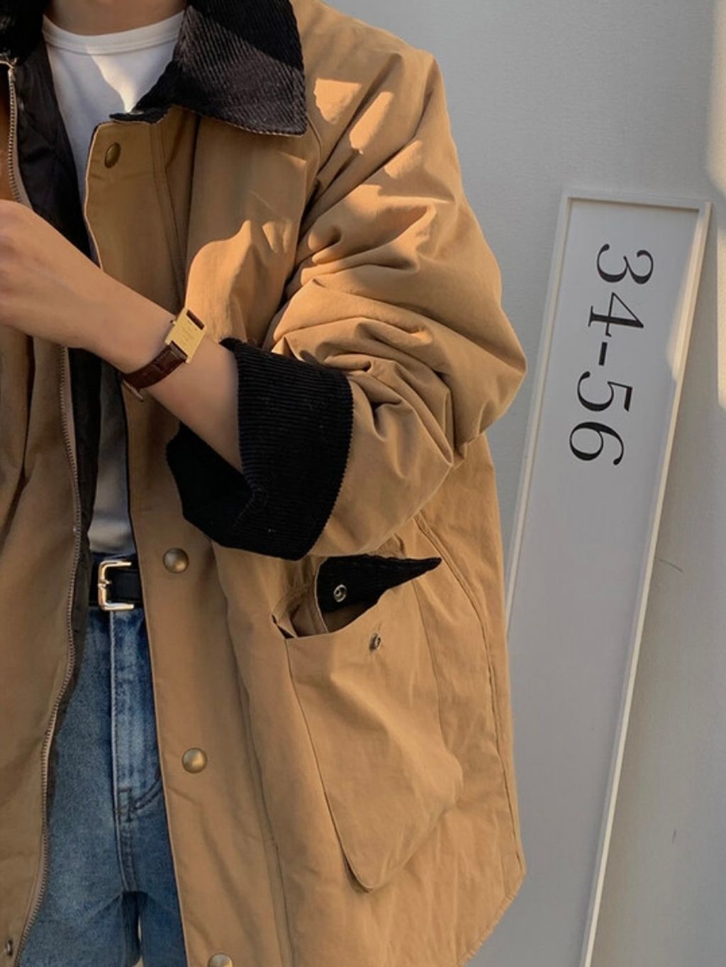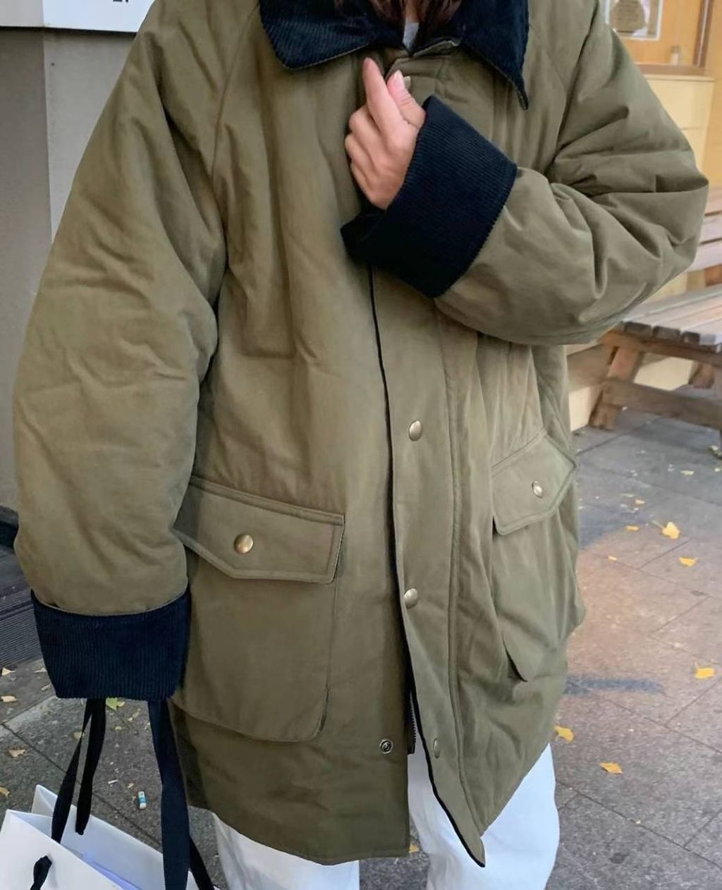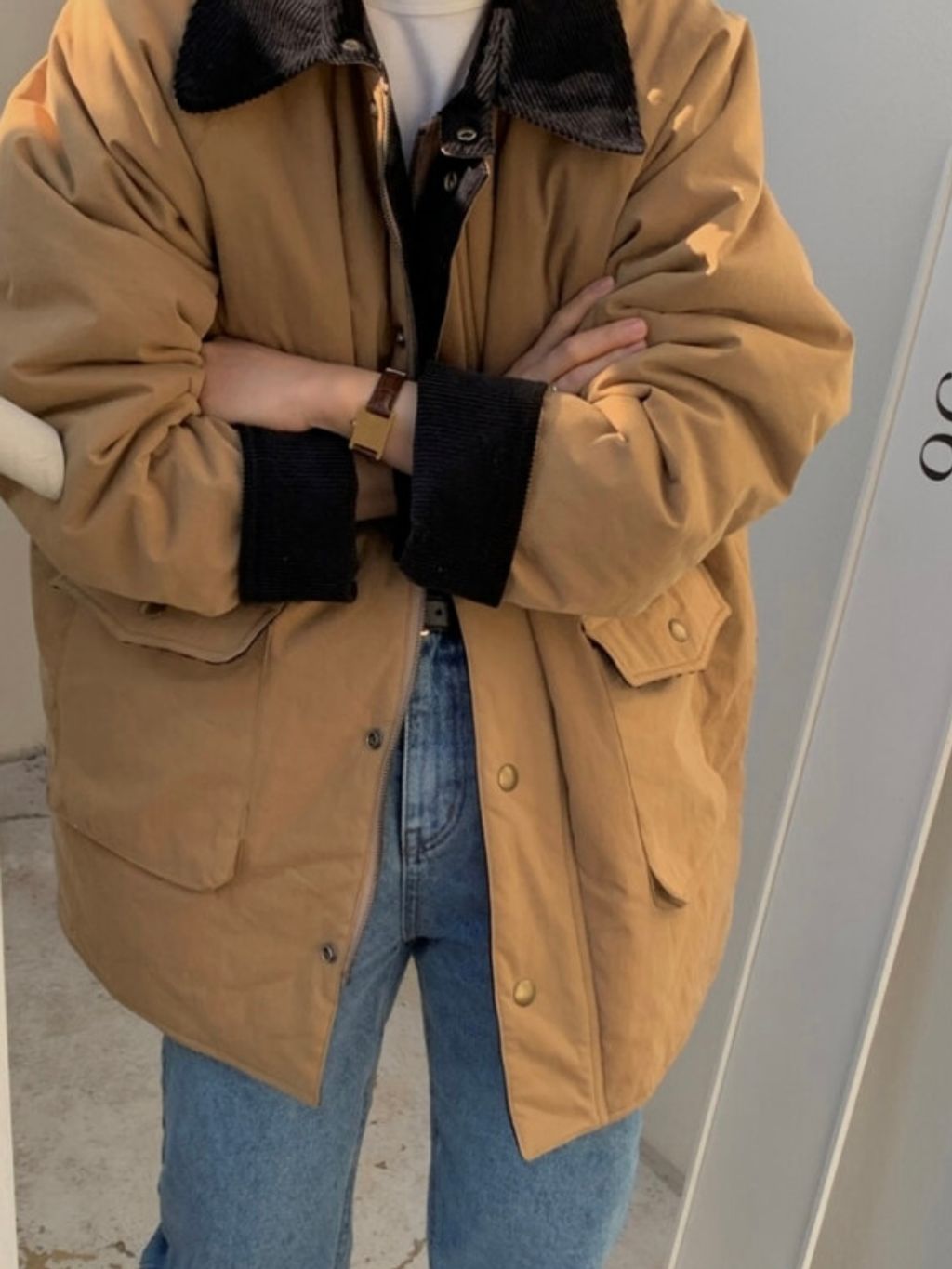 拼接燈芯絨內鋪棉落肩翻領外套/2 colors